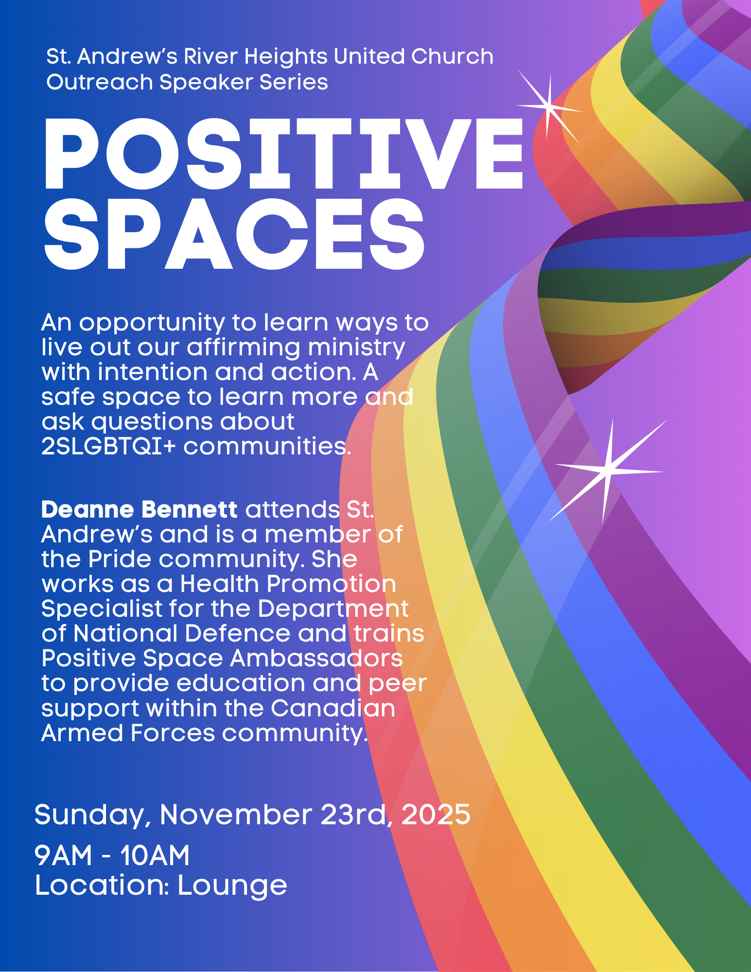 With Deanne Bennet, who attends St Andrew’s.This is an opportunity to learn ways to live out our affirming ministry with intention and action.