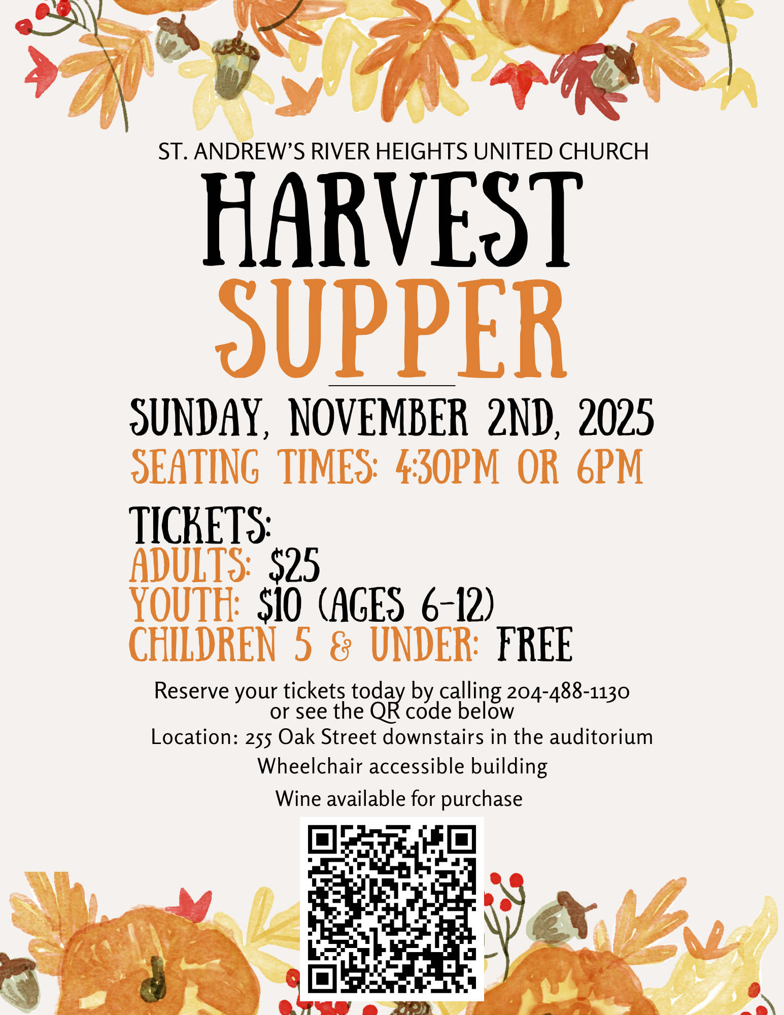 The St. Andrew’s River Heights United Church Harvest Supper is back! Join us on Sunday, November 2nd with seatings at 4:30pm & 6pm. Tickets are $25 for adults, $10 for youth (ages 6-12) & children under 5 eat free! Tickets are available through the church office Monday-Friday 9am-3pm, Sundays after church service in the narthex, or through Eventbrite. We look forward to seeing you there.